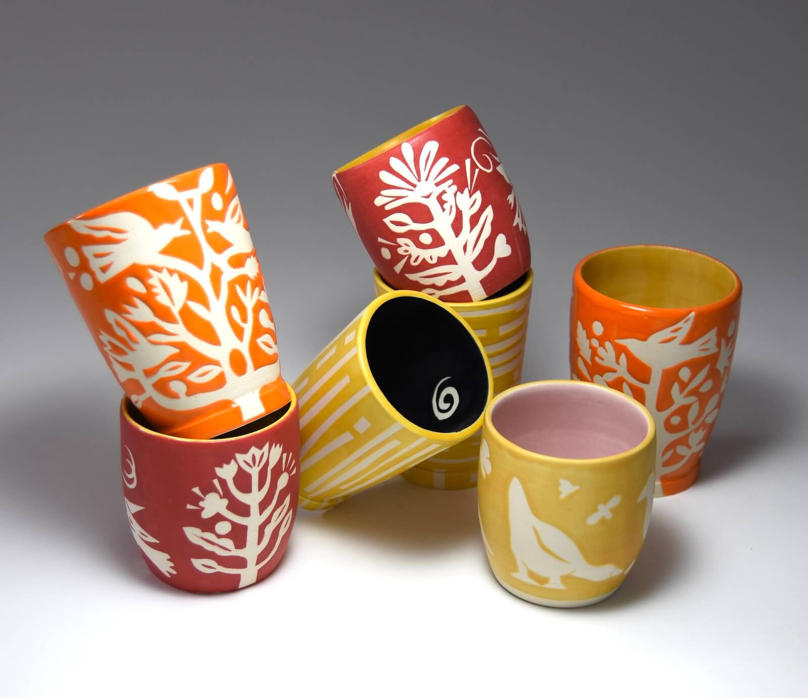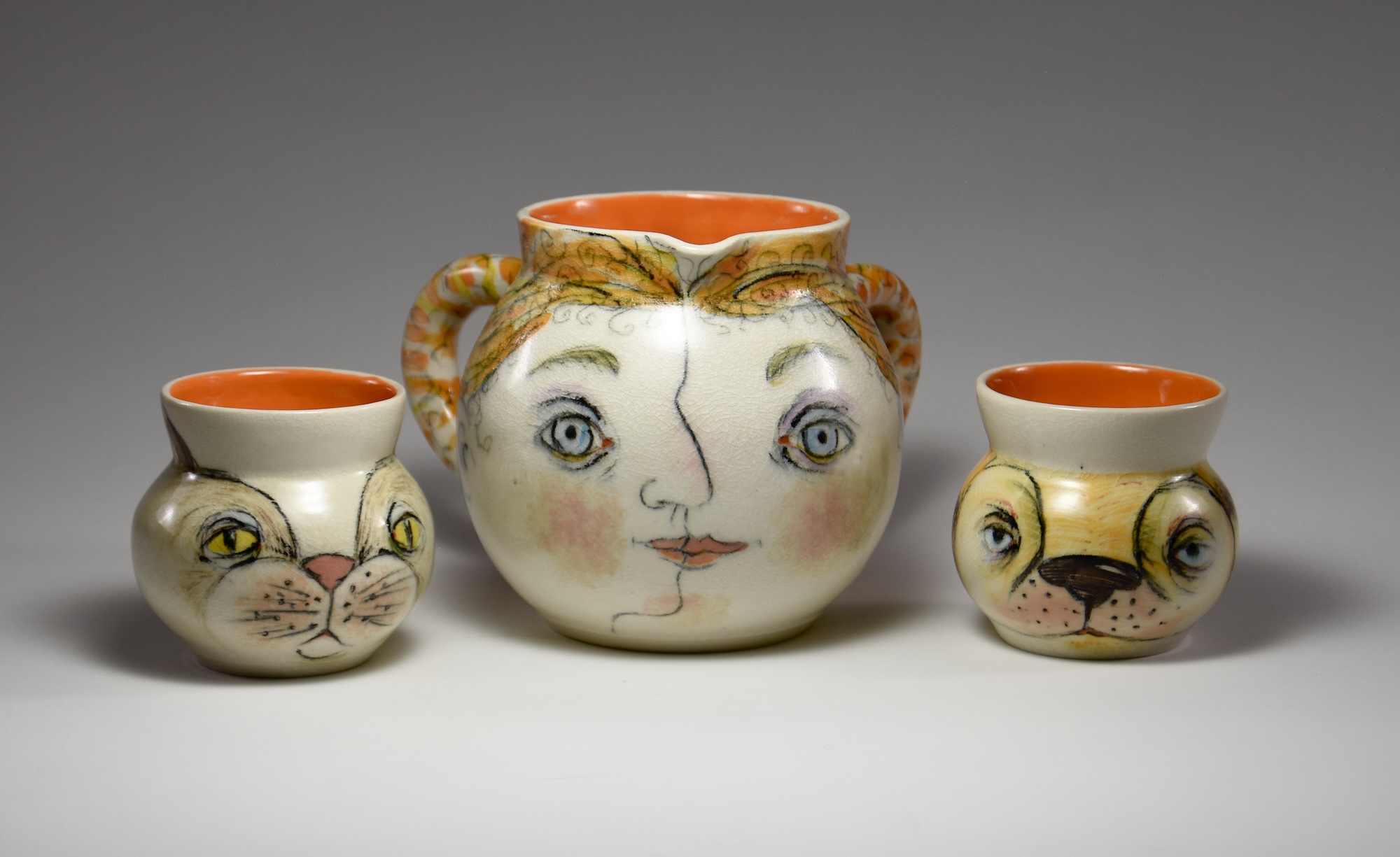 Pigtails and Pets (Vase and Cups).  Porcelain, Underglaze, Glaze. Sold