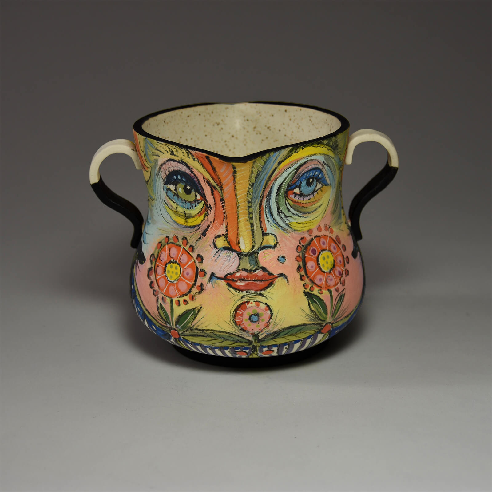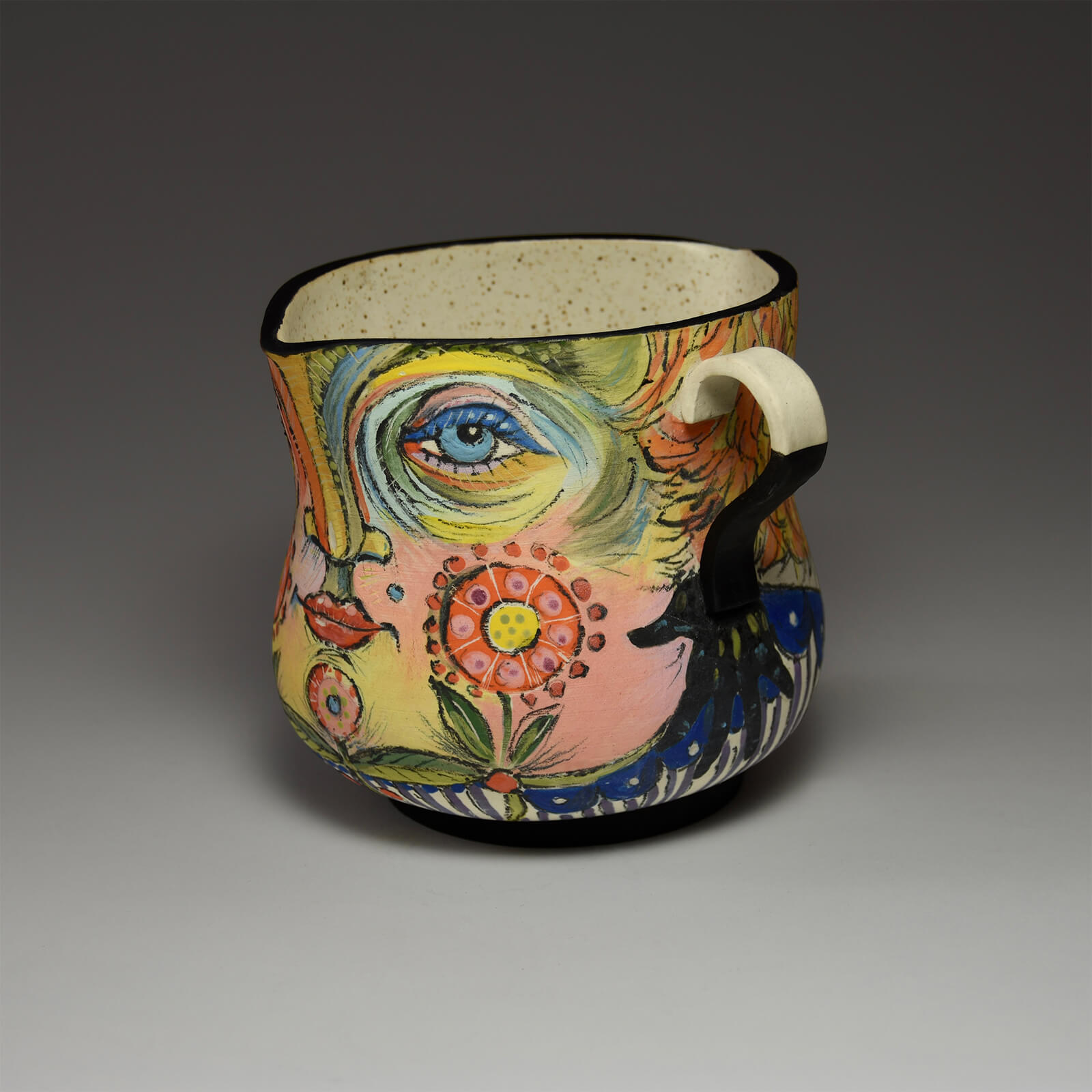 "Mmm Hmmm...Oh Yeah" pitcher. Porcelain, underglaze, glaze. 5.5 x 6 x 6 inches