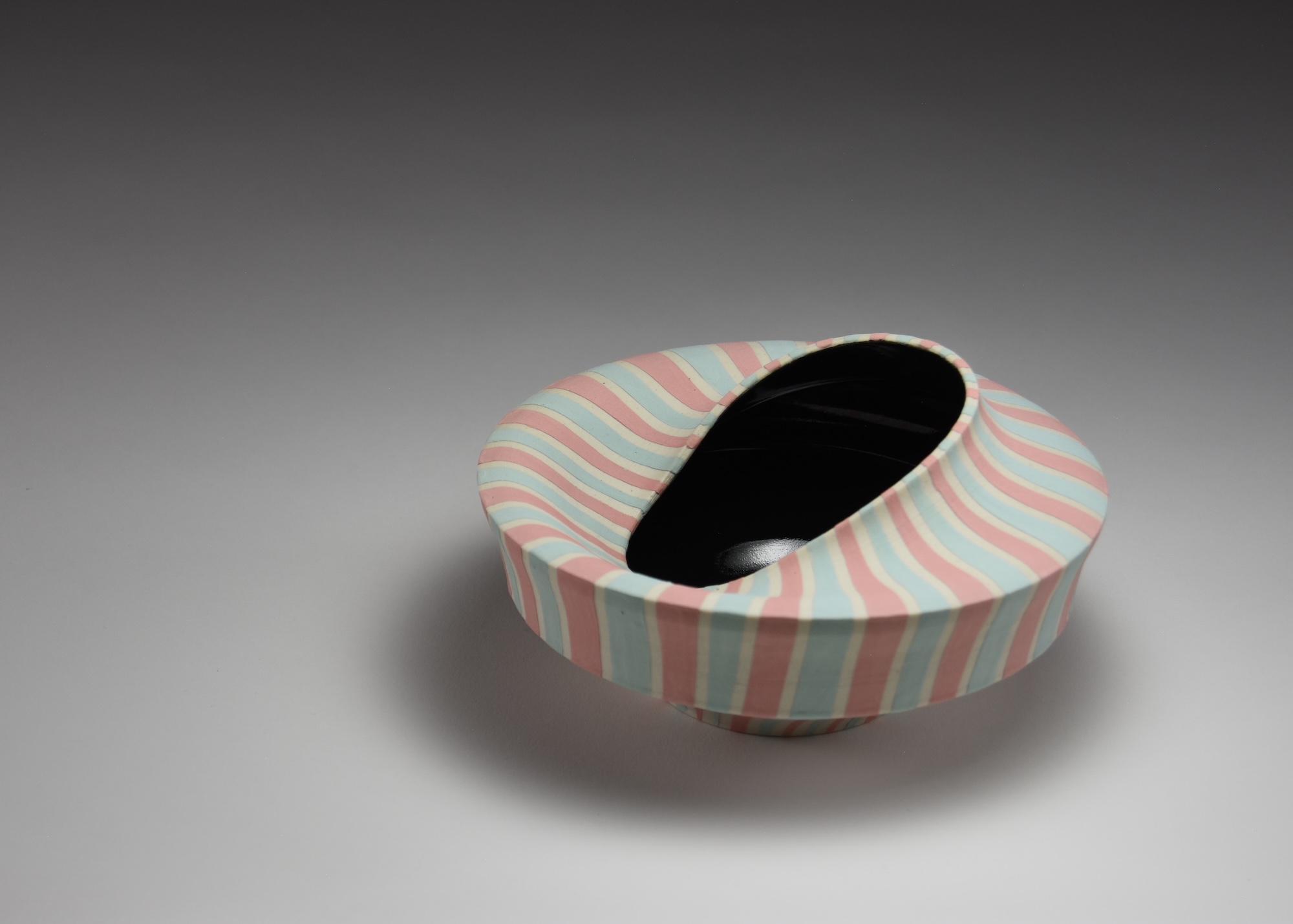 Double Walled, pink, blue green and yellow low vase. Porcelain, glaze.