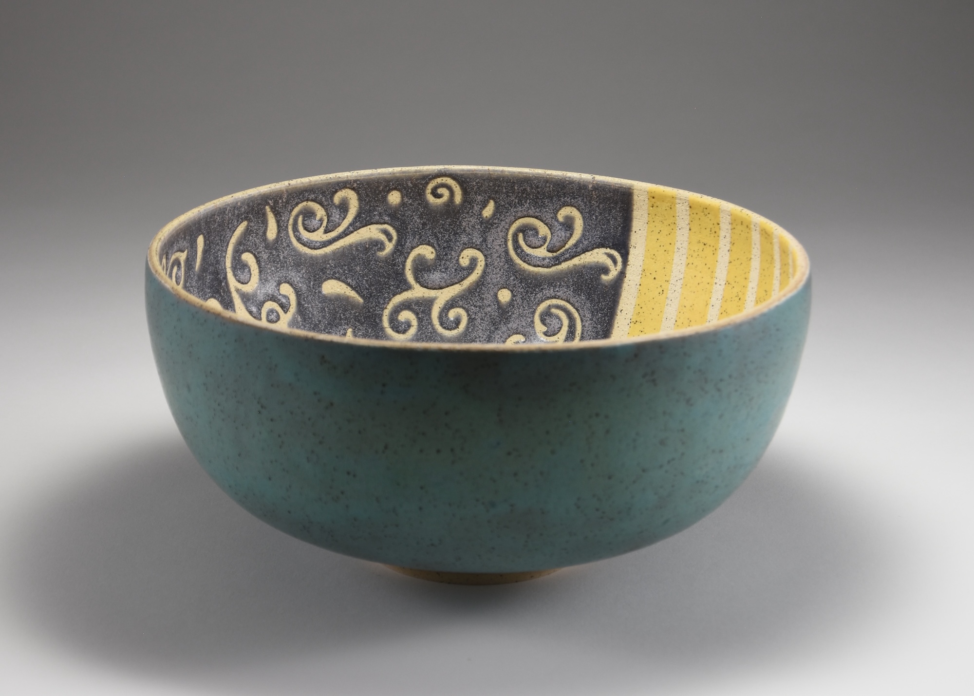 "Carnival Bowl". Hand Built Ceramic, Glaze, Metal Leaf, Turquoise Beads, Thread